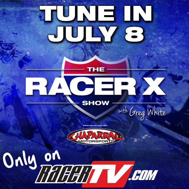 Tune in tonight to RacerTV.com for the Racer X Show with Greg White. The weekly news and highlight show will be posted Tuesday evenings on RacerTV.com and covers top professional racing series such as the Lucas Oil Pro Motocross Championship, the AMSOIL AMA Grand National Cross Country Series (GNCC), GEICO Motorcycle Endurocross Series, AMA Pro Flat Track Series, Mtn. Dew AMA Pro ATV Motocross Championship (ATVMX) and so much more. For more details on tonight's show follow @RacerXShow and @GregWhite on Twitter.