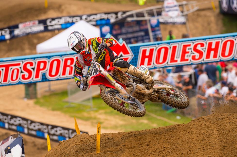Wait a minute … we’ve got a big change on our hands. GEICO Honda’s Eli Tomac just ripped the Millville win away from the dominant Red Bull KTM duo of Ryan Dungey and Ken Roczen, going 1-1 after a series of duels to notch his first 450 win ever. Looks like last year’s 250 National Champion is ready to make a run for victories late in the season—although he’s out of title contention since he missed the first few races with a collarbone injury.