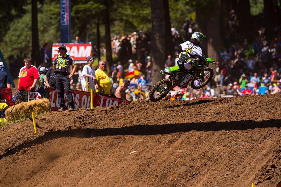 First moto I got off to really my first okay start of the whole season. Then I ended up going down the first lap and down the second lap and down again on the fourth lap! So, I got all my crashes out of the way early! I think I was in seventeenth or eighteenth and just kept charging forward. I felt like I was riding really well but just had those crashes. I came back to ninth, so that was okay. Second moto—same thing. Got a decent start and went down again. I feel like I’ve been riding on a fine line between being in control and going slower versus really pushing it outside my comfort zone and going faster. I’m kind of waiting for that to evolve into controlled speed. I felt like I had that speed early in the season, but I had a really big crash at Hangtown and kind of slowed down a little bit. I’m going to go home, do some testing and see if we can make the bike fit a little bit more to the faster speeds and the corner speed I’m trying to carry now. Overall though I went 9-9 for ninth, which isn’t great and isn’t too bad.