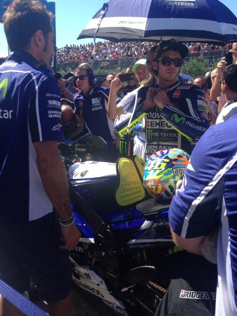 Sunday morning was just electric. The closest thing I can compare it to is Anaheim 1 in the motocross world. All of the fans are so happy to see Rossi at home and Italians, specifically, are just incredibly passionate as well. They were cheering him all the way around the track, whether he was warming up, on a qualifying flyer, or leading the MotoGP race. As we closed in on race time, the anticipation grew into frenzy. We were in the garage and shielded from the chaos, but just outside the crowd was immense. Everyone inside the Yamaha garage was confident, but as everyone knows with racing, it's always a guessing game once the green flag flies.