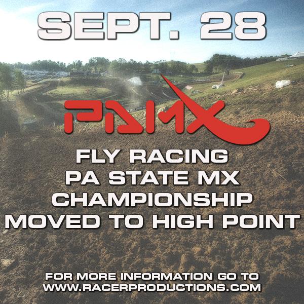 A reminder to all PAMX riders on the upcoming PA State MX Championship: Due to the closure of Steel City Raceway, the PAMX Fly Racing PA State MX Championship will be held on September 28, 2014 at High Point Raceway in Mt. Morris, PA. For more information on the event, go to www.racerproductions.com.