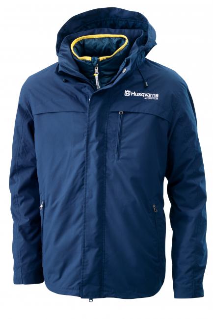 Functional, water repellent and breathable 2-in-1 jacket with removable, separately wearable, warming quilted inner jacket. Slit side pockets, zip breast pockets and inside pocket. Inner jacket features practical slit pockets both inside and out. Outer jacket has a detachable hood, adjustable drawstring on waistband and hood, cuffs feature Velcro fasteners.