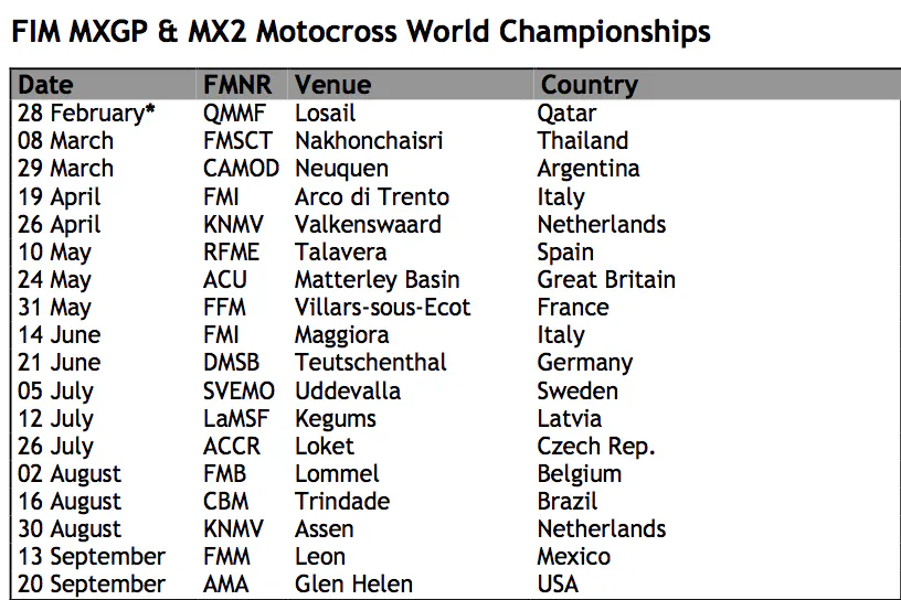 - Gone from previous schedule: The MXGP of Finland (Hyvinkaa), the MXGP of Russsia and the second MXGP of Argentina (Mendoza).