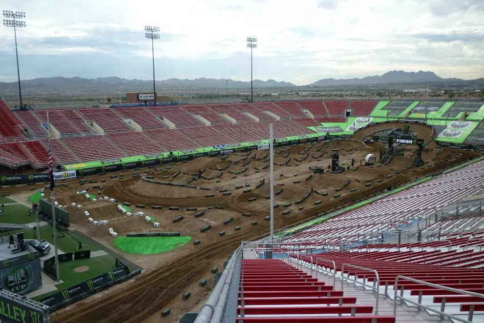 The track they’ll do battle on is as cool and innovative as the MEC track always is, with a few new items sprinkled in to keep it fresh. The most noticeable addition is the split start. They’ve run a split start before, but the pack merged as soon as it entered the stadium. This year the two individual groups will stay separated and rocket down extremely long drag strips that run the length of the stadium before two flat 180 degree turns slow the riders down and funnel them together safely. Expect speeds to break seventy mph here. Another addition is the jump combo in the Joker Lane. There’s a single, table and another single. So far the obvious choice has been an on-off. There’s also a booter of a triple here too. As far as supercross triples go it’s not especially long but it’s throwing the riders up extremely high. If anyone flat lands this one it’s going to hurt!