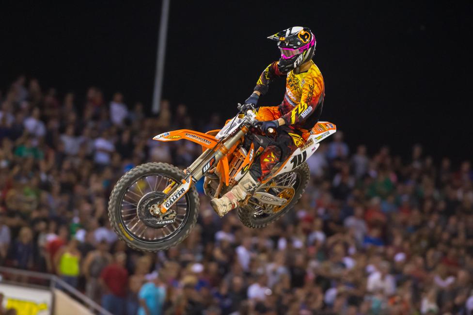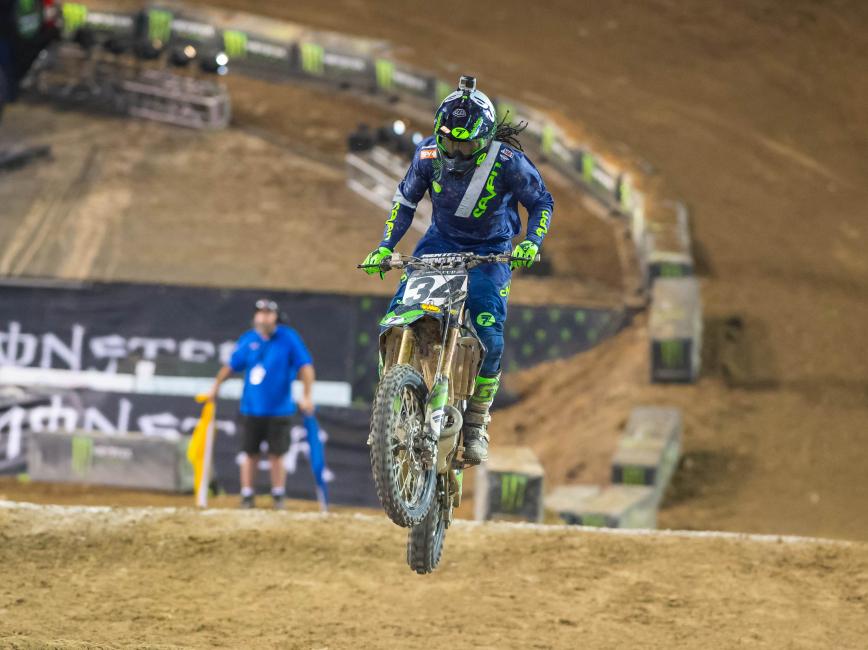 Long day. It’s been a while since I’ve raced! It started out good in practice; we were feeling good and comfortable. First race I was riding good—I was in third and making some ground on the leaders—but I crashed in a corner and got pretty tight. That wasn’t good. In the second race, rode tight. It’s tough for me, the team, and Johnny O [Barcia’s trainer]; we’re all pretty bummed. I haven’t had a lot of time on the bike, but in practice I felt pretty good, so we didn’t really have a lot to go off of. Clearly, we weren’t where we want to be. Everyone’s bummed, but this track isn’t very good. It’s actually terrible, for me anyway. I don’t think anyone liked it, except if they had a good night like Trey [Canard] or Davi [Millsaps]. It’s not like a normal supercross track, but it’s still tough because I had some expectations coming in here.
