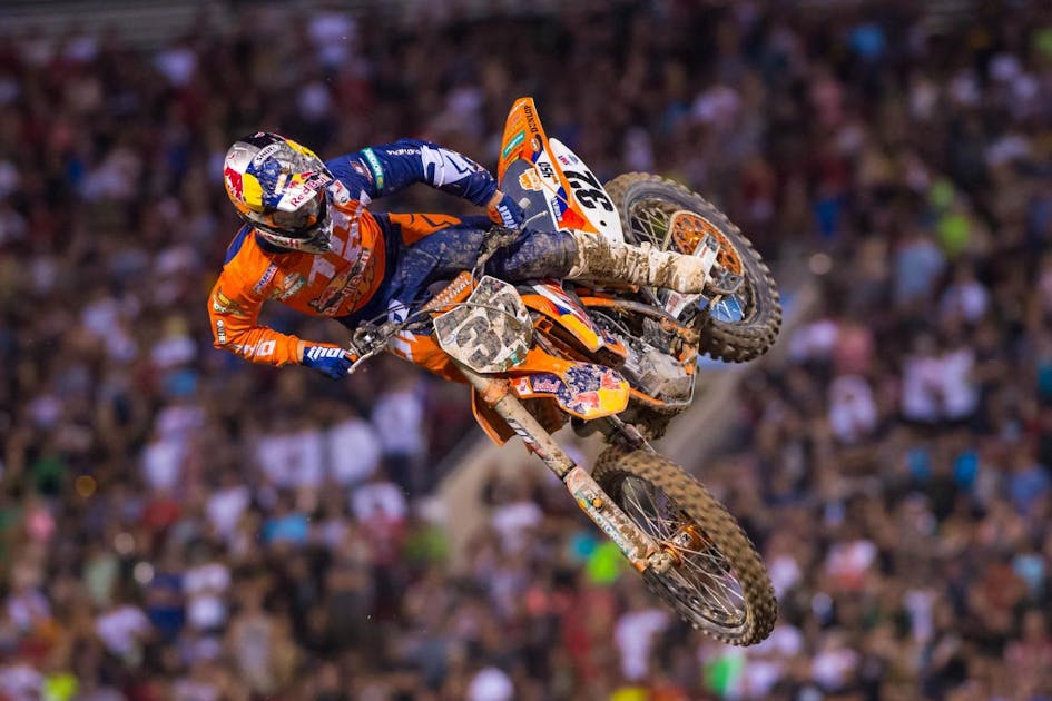 Red Bull KTM’s newest recruit, Justin Hill, made the most noise Saturday night in his 450 debut. In 2014, his second pro season with Monster Energy/Pro Circuit Kawasaki, Hill won his first career 250SX West Region race at San Diego and the East/West Shootout in Las Vegas. He also had four podium appearances. It lead to a deal with Red Bull KTM for 2015, which will see Hill on orange for the first time since his 65cc days. On Saturday night, Hill challenged Trey Canard in the first two races before finishing second in both. The Oregon native had his chance at the overall entering the third main event, but a crash in the rhythm section led to an eighteenth-place finish—sixth overall on the night. “I am bummed that I had a poor last moto, but overall happy with my results,” Hill said in a press release. “I feel really comfortable on my new Red Bull KTM and I was happy to put the bike on the podium twice in my first real race aboard a 450. Now I will go back to the 250 and prepare for supercross season.”