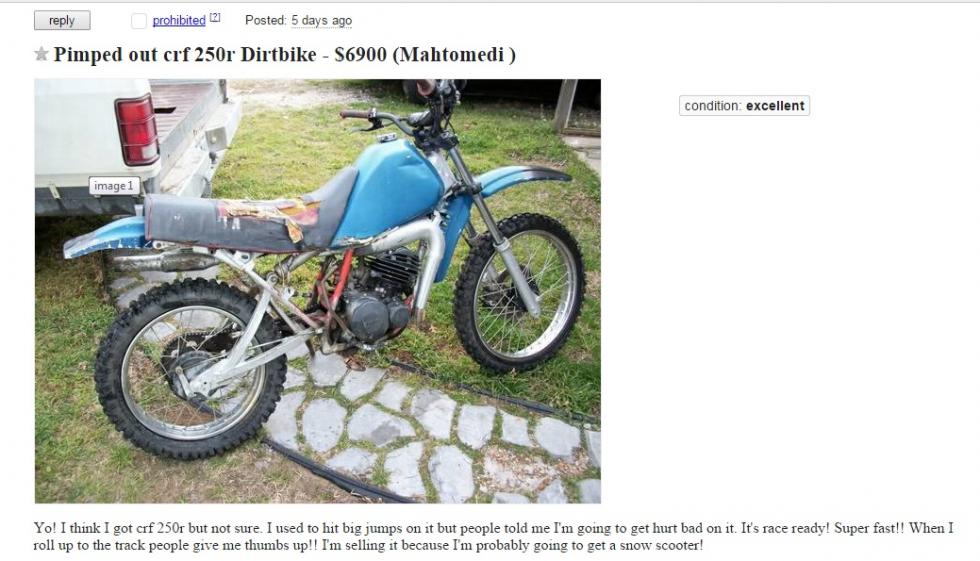 Anyone who has bought a motorcycle from a Craigslist posting is aware of just how many heaps of garbage you have to sift through to find something good. In our case, the actual garbage is the gold, and we’re passing it on to you with four gleaming examples of Craigslist’s finest. Enjoy, and as always, please feel free to email your own submissions to aaron@racerxonline.com.