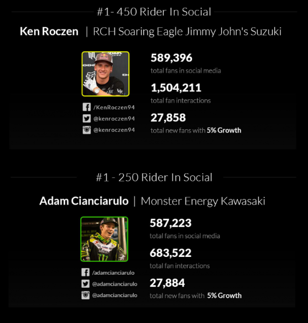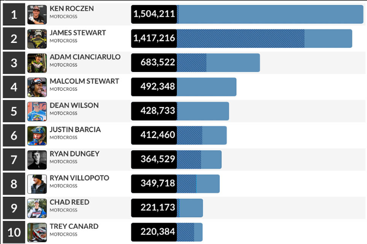 Social media is changing the way we view sports and professional athletes. Breaking news, right? Tell you something you don't know? Well, Hookit, a company that "connect(s) athletes with sponsors through the 'Internet,'" tracks social media growth amongst action sports athletes and releases monthly reports. The big revelation this month is that Ken Roczen, according to Hookit, has taken over James Stewart as the top motocross athlete. According to Hookit, Roczen's social reach expanded to over 500K fans and generates over 1.5M fan interactions.