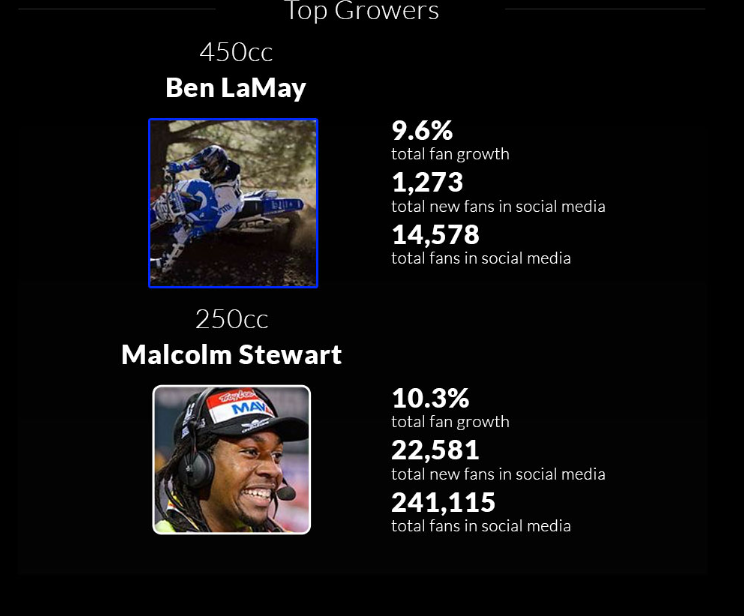 The top growing athletes this month were Ben LaMay (450 Class) and Malcolm Stewart (250 Class), each of whom generated a 10-percent increase in fan growth, according to Hookit.