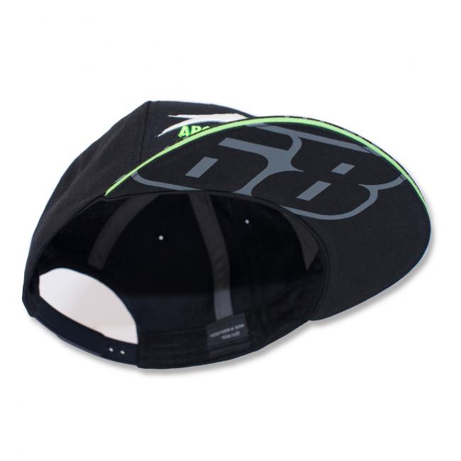The official snap-back hat of Hibbert and his crew. Monster Energy, Arctic Cat, and Ram Truck logos are featured in raised embroidery. The brim features his number and is accented by grey and green graphics.