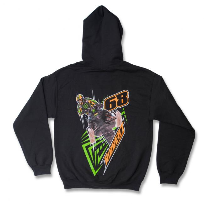 Bright orange and green graphics highlight Hibbert’s name and number on the front and a detailed image of him racing on the back. The T-Train hooded sweatshirt is available in adult and youth sizes.