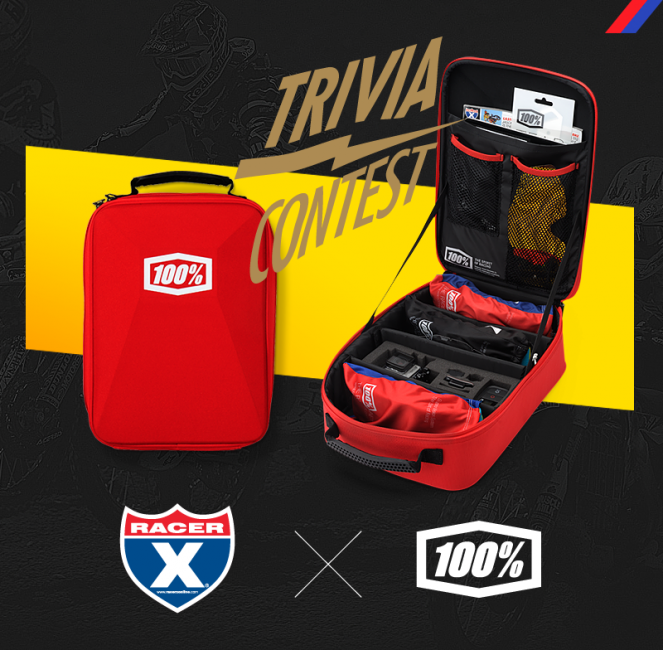 Racer X and 100% teamed up to offer you, our loyal readers, a chance to win a cool prize right in time for the holidays. Thanks to 100%, we gave away a goggle bag with three pairs of goggles to one lucky winner. After digging through more than 200 entries (you guys rock!) we have produced a winner: Congrats to Philip Crabtree. Philip got all ten questions correct. Philip wasn't the only one to get all ten questions correct, a lot of you did. But, we could only pick one winner. Thanks to everyone for participating.