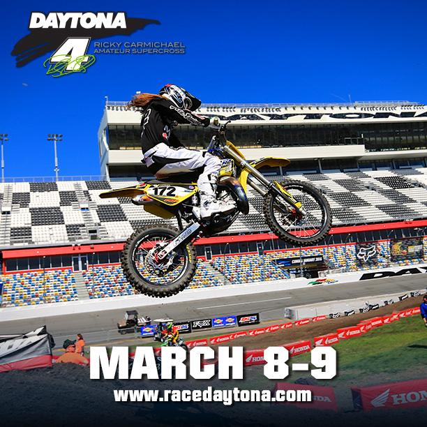 Registration is now open for the 2015 Ricky Carmichael Daytona Amateur Supercross (RCSX). The 6th Annual RCSX returns to Daytona International Speedway for the biggest two-day amateur supercross event on the planet. Following Saturday night’s Daytona Supercross by Honda, amateur racing kicks off Sunday, March 8 and continues on Monday, March 9, 2015. Most classes sold out in 2014, so don’t delay if you want to be a part of one of the most unique events on the 2015 race calendar. For more information and registration, visit the redesigned racedaytona.com.