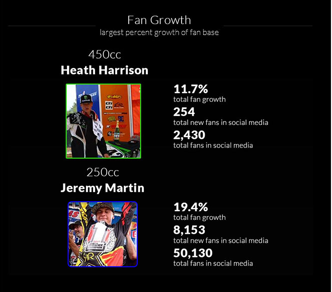 The top 450 Class rising rider in November was Heath Harrison. The privateer's fan base grew by 11.7 percent last month. Jeremy Martin's fan base grew by 19.4 percent, giving him the highest growth in the 250 Class. Check out some more numbers, courtesy of Hookit.