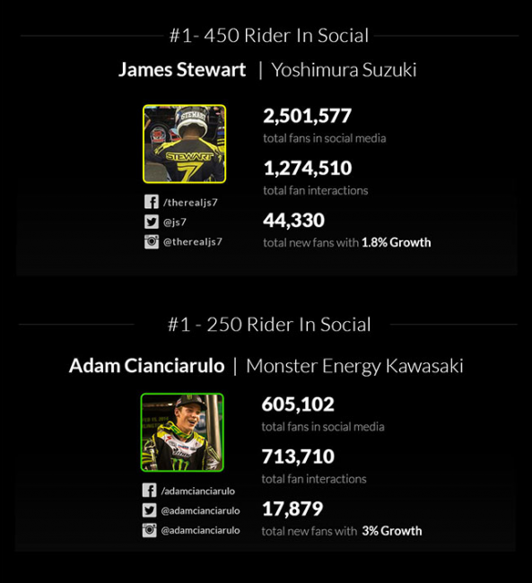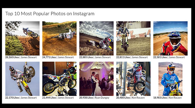 Hookit, a company that "connect(s) athletes with sponsors through the Internet," released their November 2014 social media report yesterday, and James Stewart has retaken the top spot. In October, Roczen's social reach expanded to over 500,000 fans and generated over 1.5 million fan interactions, according to Hookit, making him the biggest motocross star on social media. This month Stewart has seven of the top ten Instagram posts of the month, and his total fan base grew by 44,000 fans and reached over 2.5 million, according to Hookit. Those fans generated 1.3 million total fan interactions, giving Stewart back the crown of top social media motocross athlete.
