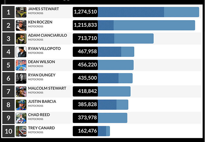 No surprises in the 250 Class, as Adam Cianciarulo lead the way. He generated 714,000 fan interactions in November, and his fan base grew by nearly 18,000 fans, according to Hookit.