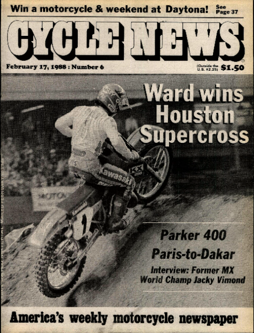 One week later, the 1988 AMA/Coors Supercross Championship kicked off for real at the Houston Astrodome (thankfully run by PACE/SRO), and Jeff Ward started this title defense much better than he had two years earlier. Wardy won the opener, his fourth win at the Astrodome in four years, giving him 25 points more than he earned at Anaheim in 1986. Johnson finished second. Then came Dymond, Lechien and Suzuki’s Erik Kehoe. Here’s some footage from Houston.