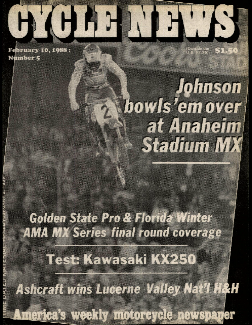 Finally, on January 30, 1988, a starting gate would drop at Anaheim—but it was not part of the AMA Supercross Series. Ricky Johnson would win his first-ever Anaheim SX—only it wasn’t actually an SX, but rather something else. But he did beat a full field of factory talent in front of the claimed attendance of 55,538 fans, though the Los Angeles Times said it was more like 38,000. New Yamaha rider Mickey Dymond placed second, Jeff Ward third, Broc Glover fourth, and Erik Kehoe fifth.