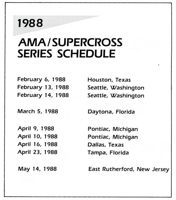 So after Anaheim was announced on the initial schedules as the opening round of the 1988 AMA Coors Supercross Series Championship and the Los Angeles Coliseum as the closer, it was determined that it would instead become part of the Mickey Thompson Entertainment Group’s Super Crown of Stadium Motocross Series—because they could not be points-paying AMA Supercross events. Tickets sold before the change would not be honored at the gates, and fans would need to return their advance purchases to Ticketron for a refund and then purchase the tickets again. The bridge burning between the two was complete, though the worst was yet to come. And when it was determined that San Diego would also end up in Thompson’s new series, he decided to call those three crown-jewel races the Triple Crown of Stadium Motocross. (The Atlanta and Pasadena races were also casualties in 1988 of the infighting.)