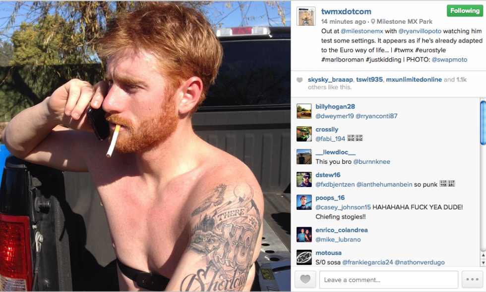 Earlier this week, Transworld Motocross decided to have a little fun. That was their first mistake. Don't they know you can't joke in moto? Especially on social media. The photo shows Ryan Villopoto with a cigarette in his mouth. It was obviously a joke. A joke that not everyone got. Seriously, though, HOW DID PEOPLE THINK THIS WAS REAL? It's sad. Everything about this is sad. Kudos to Transworld and RV for having some fun and poking the hornets' nest. You should try and read the comments; they are hilarious.