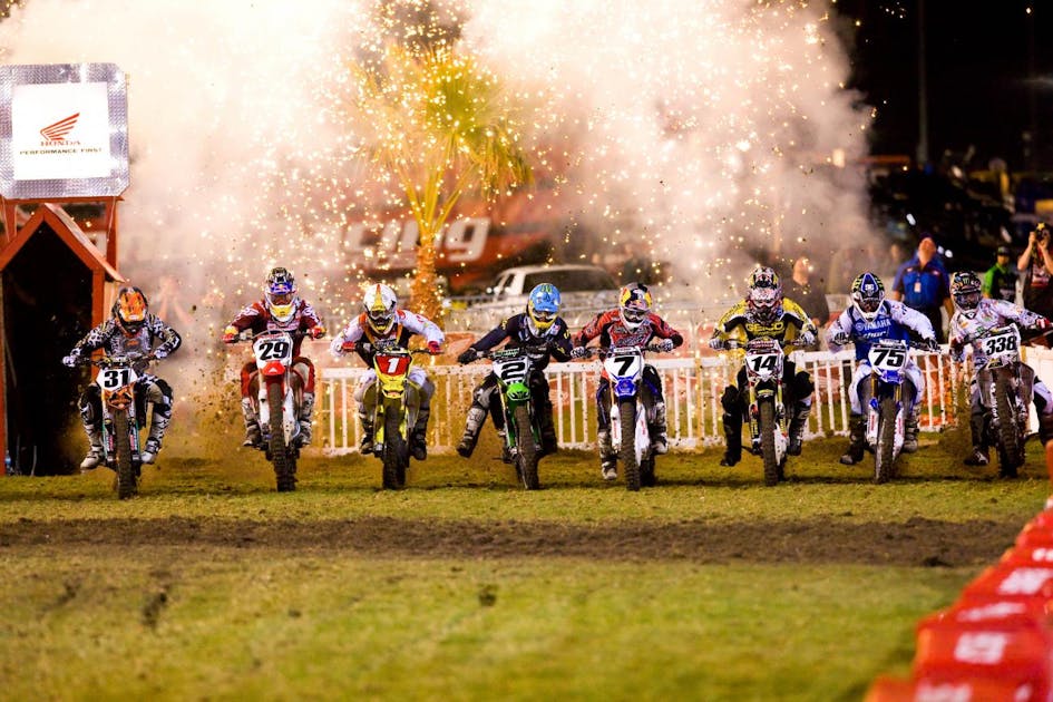 Also building steam was an incredible stat on Stewart: During his five-year career in the supercross premier class, he had won every single race he had not crashed in. That streak finally came to an end in Seattle, but not at the hands of Reed. Instead, a rejuvenated Villopoto returned to the series after missing a few rounds with illness. During his break, he jettisoned his old trainer Randy Lawrence and switched to Jeff Spencer. He also had a new mechanic for the night in Mike Williamson, as his regular mechanic John Mitcheff was away attending his father’s funeral. Eventually, Villopoto and Williamson would create the tandem that produced four straight titles. Through all the changes, and in front of his home-state Washington fans, Villopoto appeared a different rider. Fittingly, he battled past his old amateur buddy Mike Alessi to take the lead, and eventually, his first career 450 win. Stewart finished second after getting a bad start, but he did not crash, ending his career win or crash streak. Reed went down in the first turn and took a lowly seventh. Finally, Stewart was into the points lead. Here’s the Seattle race.