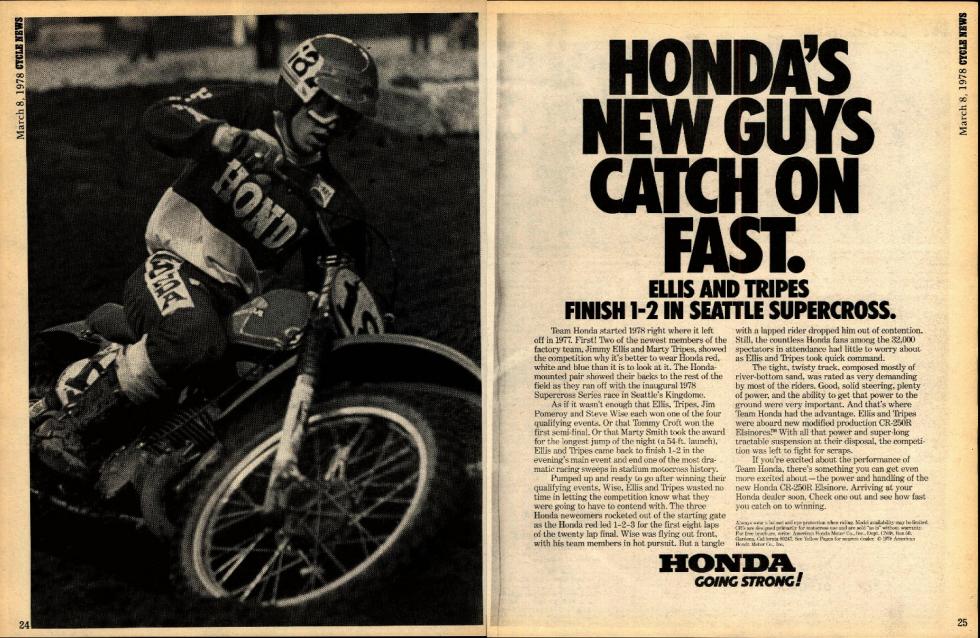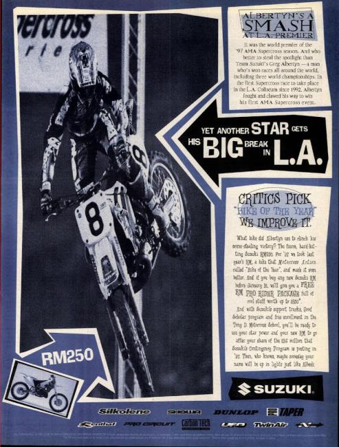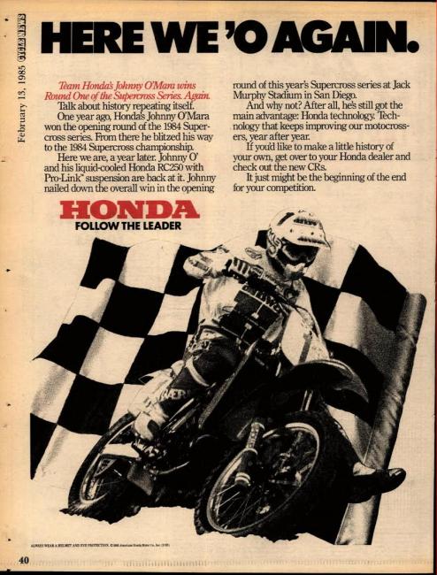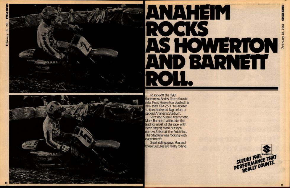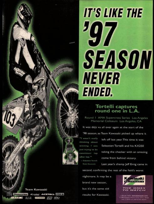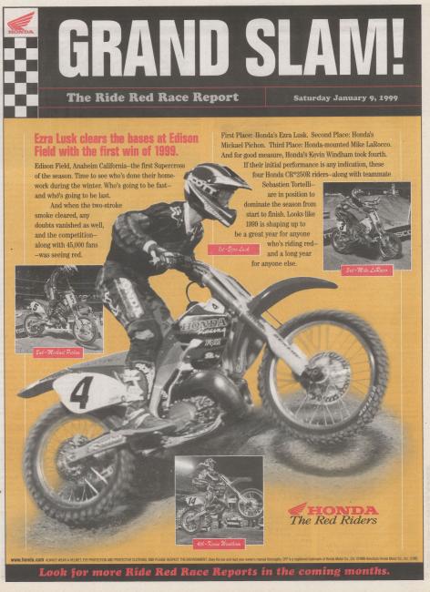 There was an old adage about motorcycle racing and factory teams that went, "Win on Sunday, sell on Monday." As a result, over the years we've been treated to a vast array of "win ads" in publications (and now online) touting the success of a motorcycle on any given Saturday night in Monster Energy AMA Supercross, hoping to get people into their local dealerships to buy themselves a dirt bike. The home for these ads was almost always Cycle News, since the iconic publication came out weekly and gave the OEMs plenty of chances during a season to raise their profile with potential buyers after a good weekend at the races. We went back and found some of our favorite Anaheim SX and other opening-round win ads from yesteryear. It's amazing to see how not only the bikes and athletes have progressed, but the complexity of the designs as a result of desktop publishing! Which one is your favorite?