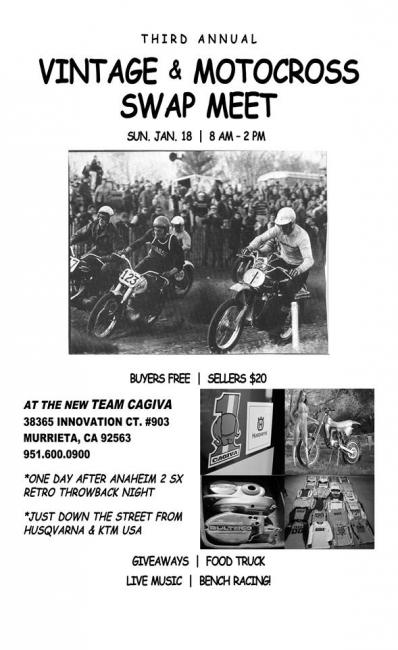 If you’re in the Murrieta, California, area on Sunday, stop by the Third Annual Vintage and Motocross Swap Meet. It runs 8 a.m. to 2 p.m. at the new Team Cagiva, just down the street from Husqvarna and KTM USA at 38365 Innovation Ct. #903.