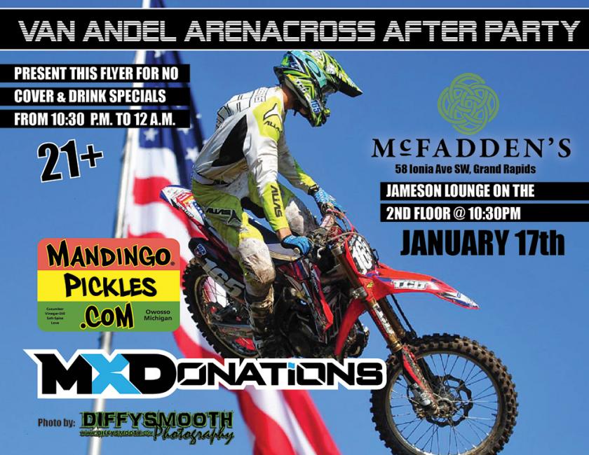 If you're heading to the Van Andel Arenacross in Grand Rapids this Saturday, January 17, make sure you check out the MX Donations/Mandingo Pickles after party at McFadden's located at 58 Ionia Avenue Southwest, right behind the arena.