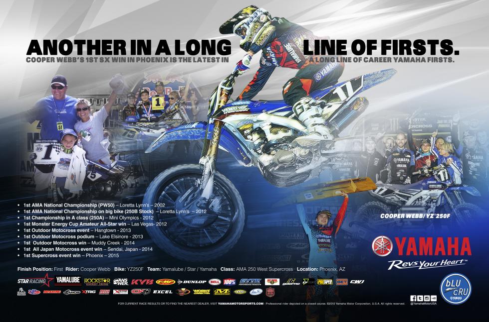 Yamalube/Star Racing's Cooper Webb became the twenty-fourth Yamaha winner in the 125/250SX Class; he's also the third from North Carolina, joining Damon Bradshaw and Broc Tickle.