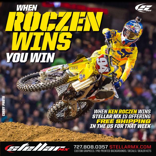 Stellar MX is offering free shipping in the US the week after supercross events that Ken Roczen wins. For more information, visit stellarmx.com or call 727-808-0357.