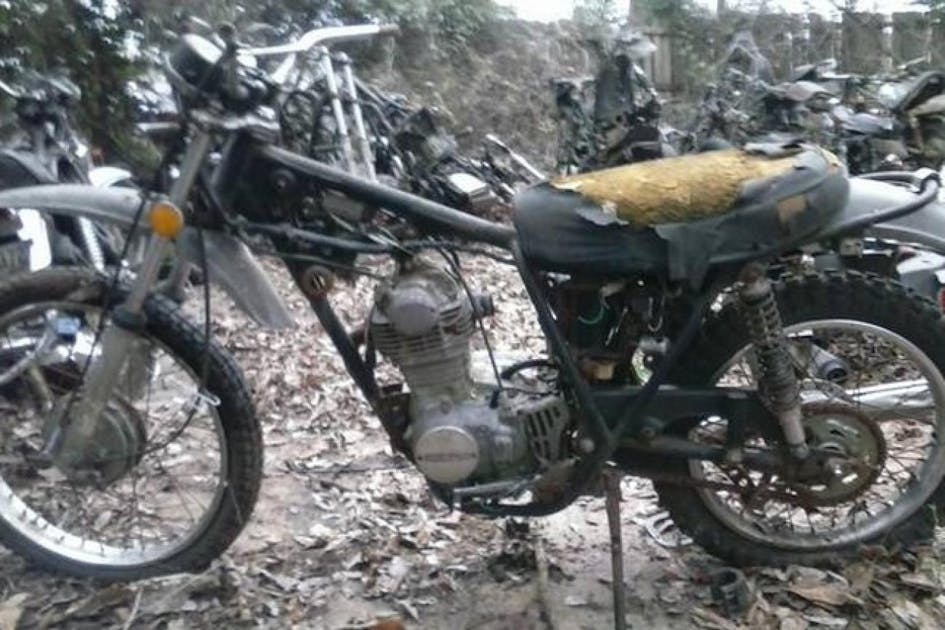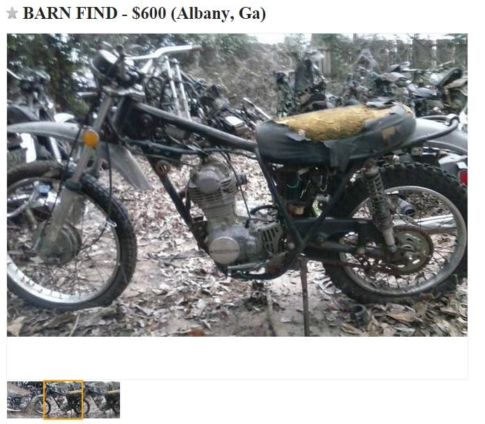 The obvious place to start here is the title of the ad: “Barn Find.” This term has become big in classic car circles. But in this case, where is this barn, and why aren’t any of the other bikes in the background in it? The bike looks like it’s been exposed to the elements—is the barn missing its roof? Perhaps English is a second language to the seller and he was trying to communicate that he is looking for a barn to house his collection. “Barn…find?” He mentions he’s open to trade—perhaps he wants to trade the bike for a barn? Maybe he had to move the bikes out of the barn because rats were eating all the seat covers? Your guess here is as good as ours!