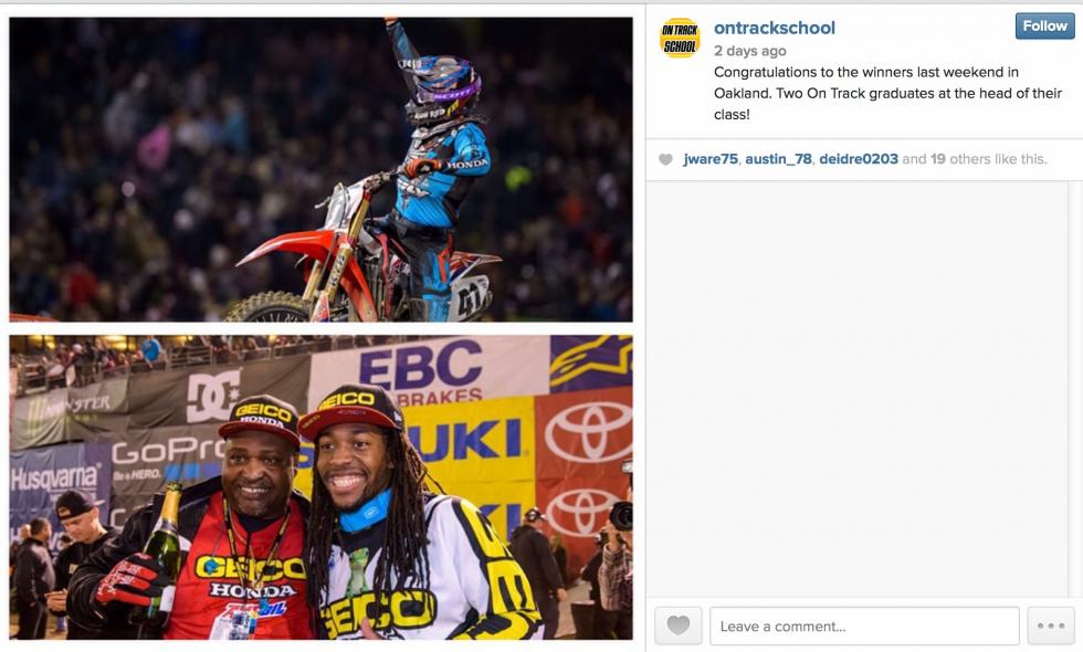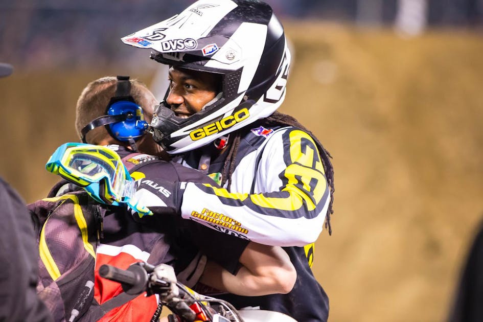That makes the latest Stewart family turn even more surprising. James has now been forced to the sidelines with a sixteen-month suspension from a drug test, the worst news he’s gotten in his career. Around the same time, Malcolm got the best news he’s ever gotten in the form of a phone call from Team GEICO Honda. His Anaheim 1 was crash-filled, but he’s been solid since and now has a win. Hey, does everyone remember when James hit the pro scene in 2002 and became the first African-American to win a supercross? Back then, everyone expected this to open the floodgates to a new generation and, yes, race of racers. Turns out the second African-American winner of a supercross was from the same generation as James: literally. It’s his own brother, thirteen years later. Credit to the Stewart family through all the ups and downs, as even though James Jr. is barred from racing, Big James is still at the races cheering Malcolm’s every move.