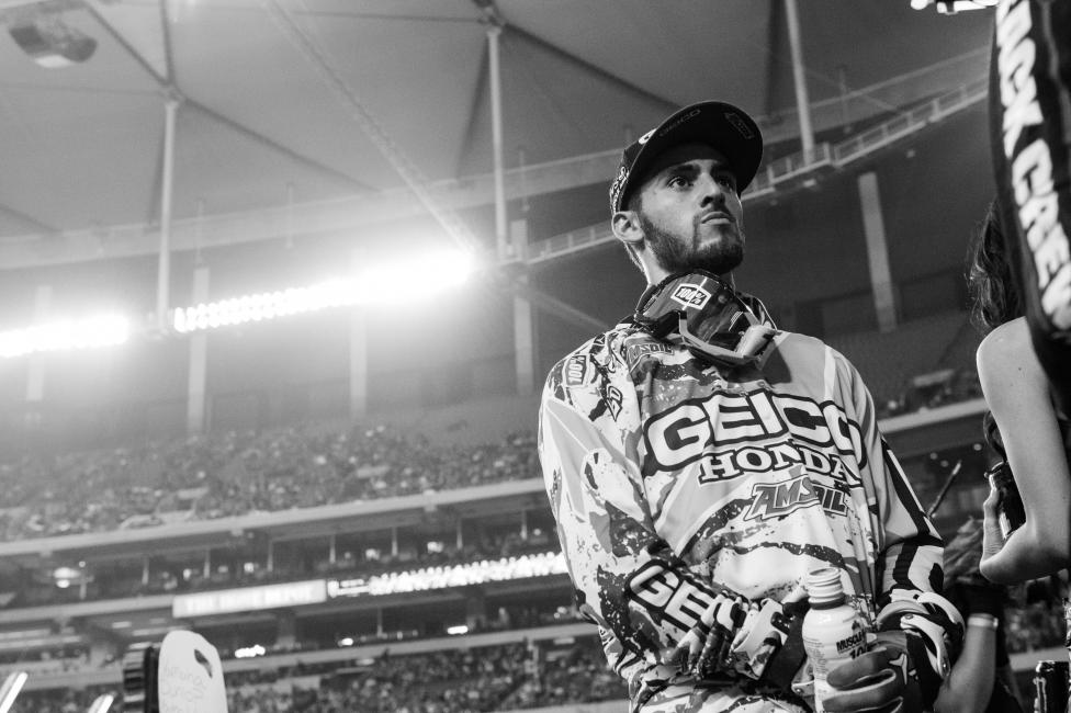 Marvin Musquin: I tried a different technique actually for the heat race and it didn’t work out. I obviously didn’t get a good start. But it was okay. I was like top five in the first lap, but then I didn’t jump a rhythm and then I went inside and someone ran into my rear wheel and it took me down. You don’t want to get down in the heat race because you want to go to the main event with a good position and a good gate pick. I fought through it and I got eighth, so I went straight to the main, but it’s a really bad gate pick so I was far outside. I was not in a good position but I tried my best. I was running in a good position, maybe fourth and then got third. I felt like I had good speed, but I made too many mistakes at one point. Then I didn’t do that triple over there, the big one, and then Jeremy passed me. And then we went by [Martin] Davalos and [Justin] Bogle. So to get second tonight, it’s actually pretty good with my heat race for sure.