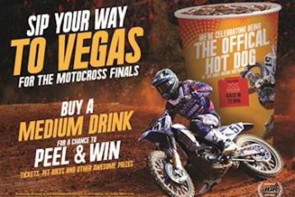 The rules of the sweepstakes are simple. All medium drinks, which have been designed with a motocross-theme for the sweepstakes, feature a “Peel & Win” game piece. There’s no need to cross your fingers before peeling since every single cup is a winner! Free food and buy-one-get-one offers may be redeemed instantly.