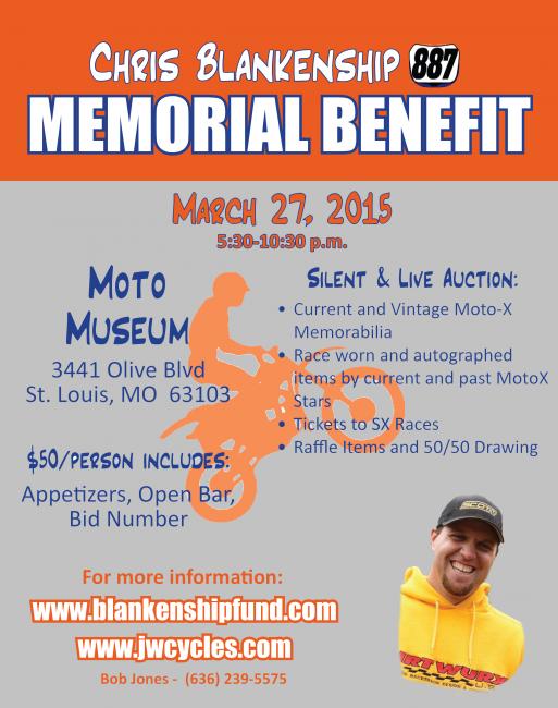 As a small gesture to help out his kids, I am having this fundraiser for Kate and Macen’s educational fund. It will take place at the Moto Museum in downtown St. Louis the night before the St. Louis SX. I am sending this out to motorcycle industry people asking for donations. There will be a silent auction and live auction. Ross Blankenship, Kory Christianson, and others are collecting jerseys and other gear during the season to be used in the silent auction.