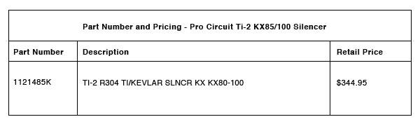 CORONA, CA - Pro Circuit is proud to announce our new Ti-2 R-304 Shorty Carbon- Kevlar/Titanium Silencer for Kawasaki KX85 and KX100 models. Just like the big bike version, the new KX85/100 Ti-2 Silencer is manufactured using a carbon fiber and Kevlar shell for light weight and durability and high grade titanium end-caps and tubing. Racers can expect the same high Pro Circuit quality and championship winning performance as our standard R-304 Shorty Silencer plus lighter weight and that "factory" look that says you're serious about winning. Available for '98-15 KX80/85/100 models and designed for closed-course racing only.