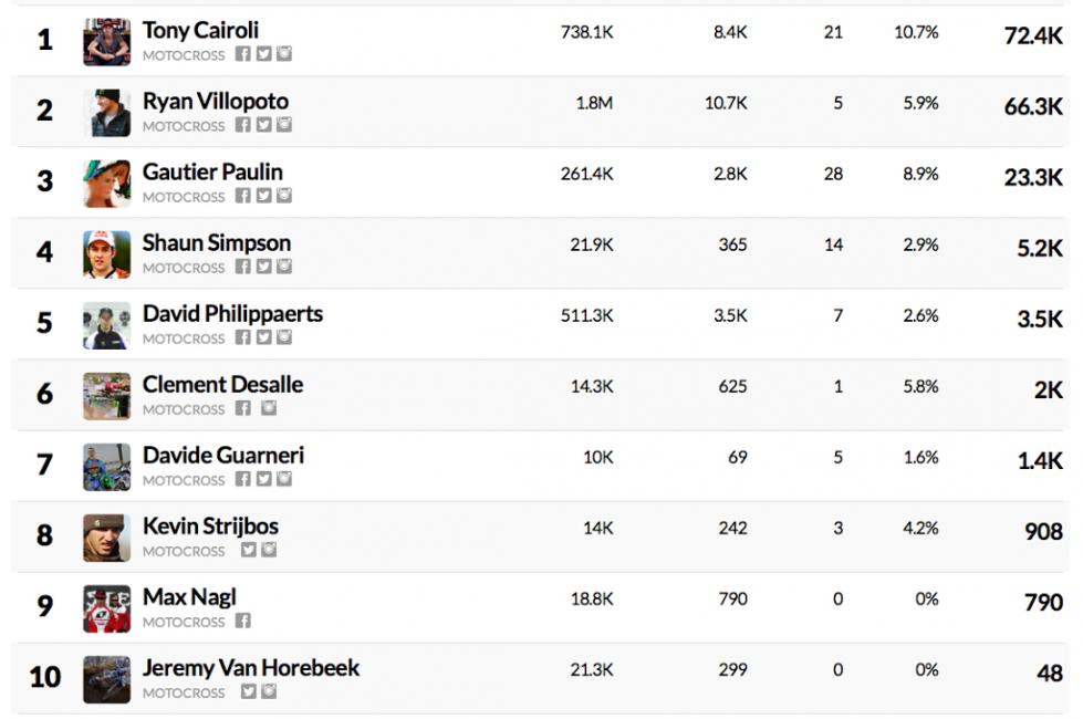 The opening round of the FIM World Motocross Championships took place in Qatar last weekend, and the guys from HookIt tracked the social interactions from Thursday through Monday. Tony Cairoli just beat out Ryan Villopoto with Gautier Paulin a distant third. Check out the top ten below.