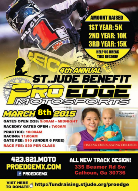 Pro Edge Motosports are holding their 4th Annual St. Jude Benefit ride this Sunday in Calhoun, Georgia, with the help of event promoter Darrel Lynn, Cameron Stone, and plenty of other local riders. They’ve auctioned off gear donated by Ryan Dungey, Trey Canard, Malcolm Stewart, and many more to raise $30,000 through the first three events. Can’t make it out but would still like to donate? Visit http://fundraising.stjude.org/proedge to help those in need. You may not have $200k to dish out, but every cent helps.