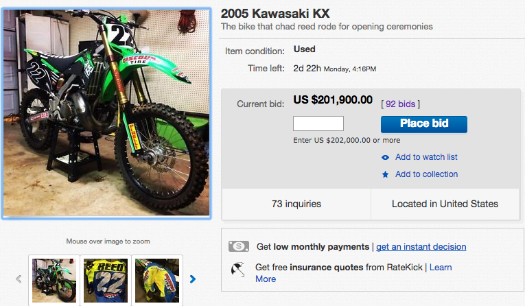 Stone put the bike, along with Reed’s signed gear, up for auction on eBay with a Buy It Now price of $8,000 early this week, saying that a percentage of the sales would go to St. Jude Children’s Hospital. Reed was quick to take to social media and condemn the auction as a way to profit off of his name, and it was a classic case of he said, he said that lit up social media along the way. The social media posts weren’t the only things blown out of proportion—the price of the 2005 KX250 is now very overinflated. By how much, you ask? The current bid is over $200,000! We’re guessing Stone is going to have a tough time getting in touch with the winning bidder.