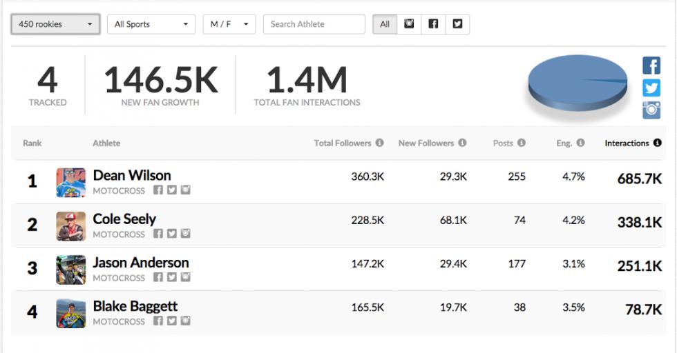 The 2015 rookie class has been quite impressive thus far. Three of the four (Anderson, Seely, Baggett) young guns have a podium appearance, and Anderson is in the midst of a ten-race top-ten streak. That’s on the track. Off the track, the injured Dean Wilson is leading the social media game. The guys at HookIt have tracked social interactions across Facebook, Instagram, and Twitter from the first of January to March 10. During that time, Wilson racked up 685.7K interactions compared to 338.1K for Seely, 251.1K for Anderson and 78.7K for Baggett. Furthermore, Wilson gained 360.3K new followers. Check out the entire chart below.