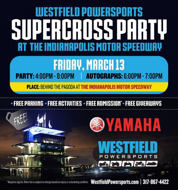 Tomorrow night, on the eve of the Monster Energy Supercross at Lucas Oil Stadium in Indianapolis, IN, several Yamaha-supported Supercross riders will be making an appearance and signing autographs at nearby Indianapolis Motor Speedway. Please join us at the event, and also, please help us to promote this opportunity for supercross fans by posting the information below on your own websites and social media channels.