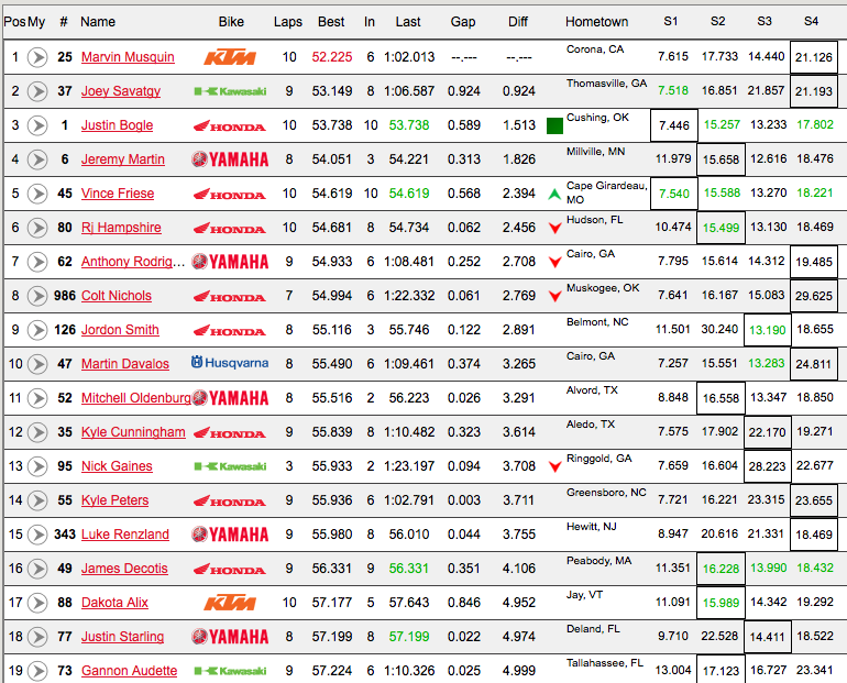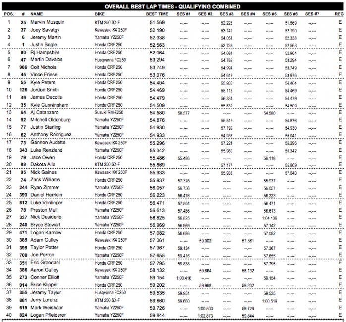 A sticky, rutted track greeted riders in the second 250 practice. “The track is going to breakdown,” said Justin Bogle following the session. Marvin Musquin was the fastest again, but it wasn’t easy. Justin Bogle and Joey Savatgy each took turns leading before Musquin flew in at the end to claim the top spot with a 51.569. Most of the chatter is about the track, which should be very rutted by tonight. In other news, Vicki Golden came up two spots she of qualifying for her first career night show. Golden looked much, much better than previous rounds and was just a few ticks off qualifying with a 59.904. Logan Pfleiderer qualified fortieth with a 59.844. Check out full times below.