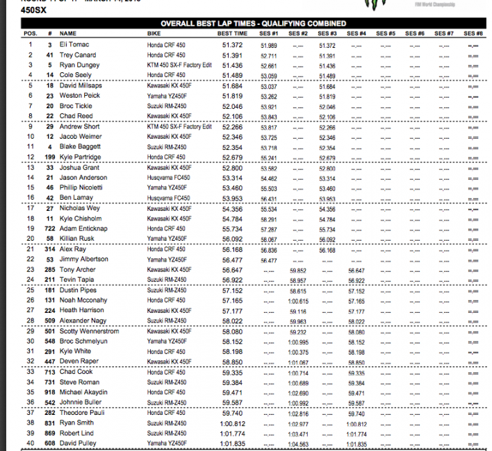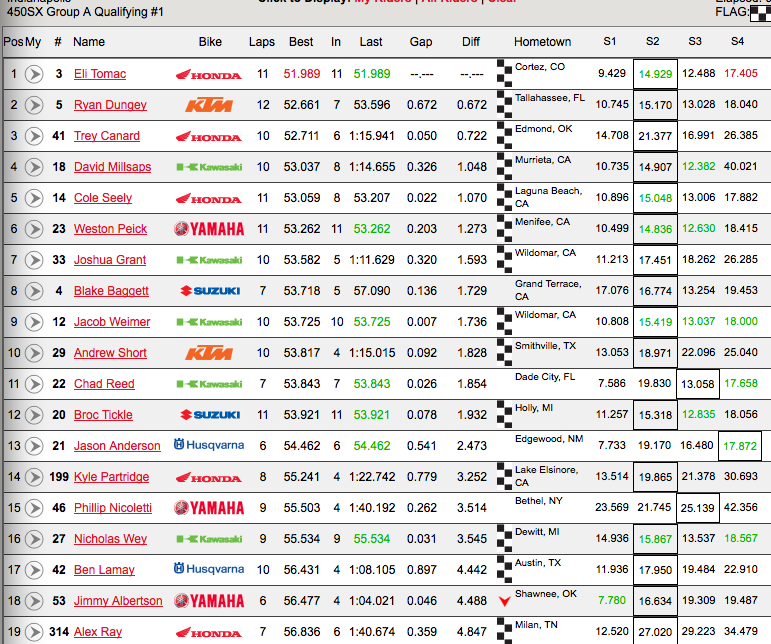 Who said there is nothing on the line this weekend? The first 450 timed practice brought a lot of noise. Blake Baggett and Jason Anderson collided while exiting a turn—Baggett cut down pretty hard on Anderson—and both appeared to be sent home from practice by the official. We will try and get more information on what exactly happened. Ryan Dungey held the top time before a red flag came out for Jimmy Albertson. It appeared Albertson’s shoulder popped out after a crash. Eli Tomac snuck in one the last lap to capture the best time over Dungey.