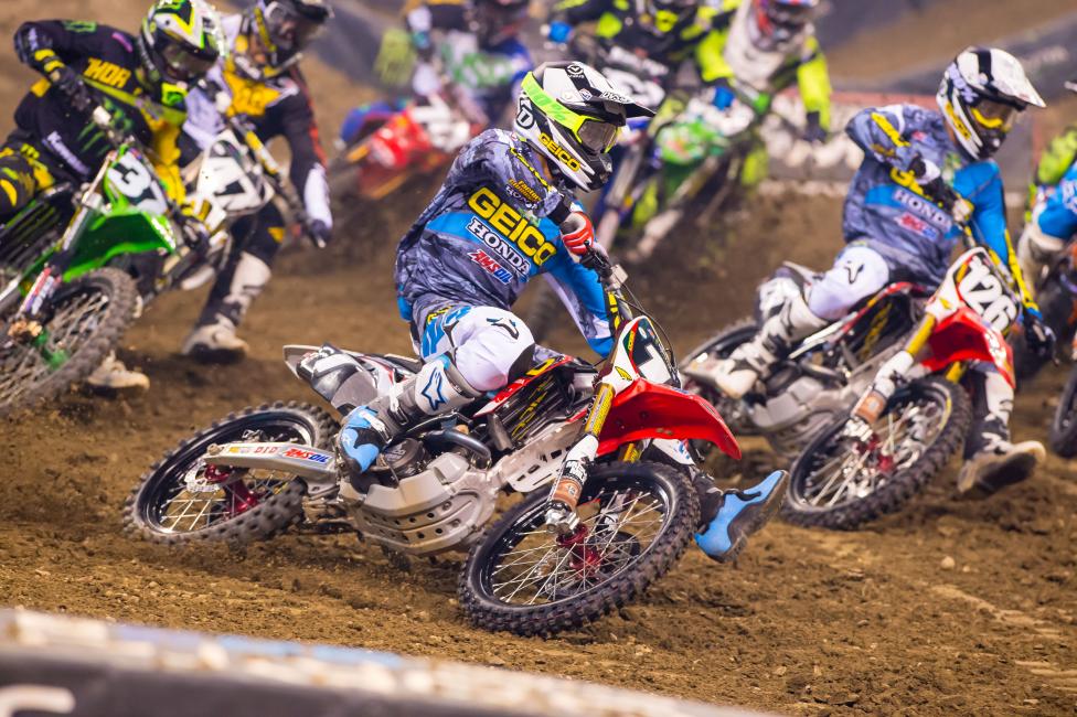 It did. I made sure on parade lap I had my jump line in the whoops because jumping them was easier. Then after the finish I wasn’t doing the table to single all day and I ended up doing that in the main and then the rhythm after the first straightaway, the three in, I hit that every lap in the main event consistently. That’s what saved me. It kept me calm, kept me relaxed. I would rail guys in there and then just block them in the turn before the triple and we’d both double the triple, but it was a pass. I’m happy with a sixth, but not really. We both know what it takes to get on one of these teams, and they want to see a guy like me podium because I’m a veteran and I know what I need to do to get up there.