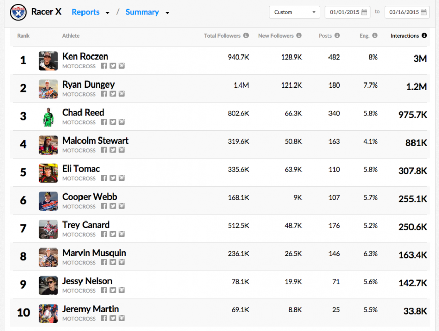 Thus far in 2015, we’ve seen a total of ten winners (five in 450SX, three in 250SX West and two in 250SX East) in Monster Energy Supercross. During that time, Hookit has tracked the social interactions of each winner. And to no one's surprise Ken Roczen is ranked #1 on another social media list. Ken has a global reach that attracts a lot of fans. The first 250 guy we see is Malcolm Stewart. If you don’t follow Malcolm across social media you should—it’s good stuff. Check out the entire top ten below.