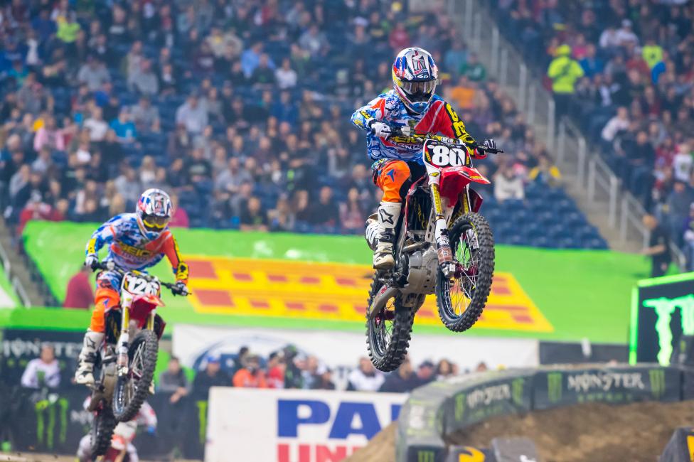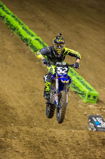 Jordon Smith: Practice started out pretty rough. Had a gnarly crash there in the free practice. Rebounded and qualified eighth so I was pretty happy with that. Got a really good start in the heat race, out there with RJ. We were just clicking off some laps up front. Ended up going down—kind of a stupid little crash. I don’t even really know what happened, what made me crash. Went down and barley qualified, got ninth. So I had a bad gate pick and just got shuffled to the outside a little bit on the start in the main, and ripped my rear brake pedal back to my foot peg. It was a tough night but I brought a lot of positives out of it.