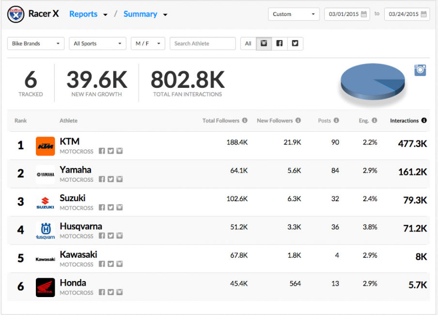 Riders aren’t the only ones using social media. Teams and manufactures are also heavily involved. Hookit has tracked the major brands on Instagram through the month of March and KTM is currently leading the charge with just over 477 thousand interactions. Yamaha is next with just over 161 thousand. Check out the rest below.