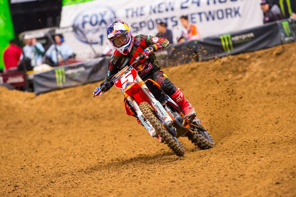 Ryan Dungey: Tonight was good. We had the fastest qualifier coming into the night show. Got ourselves a good start in the heat and rode some good laps and was able to get a heat race win. Set ourselves up good for the main. Going into the main event, I say it every time, but I knew the holeshot was going to be important. This track especially because it was really hard to get up on the inside of somebody with how fast the turns were. Fortunately we got a good start and from there I just really tried to focus on my opening laps. I saw [Weston] Peick and [Jason] Anderson behind me, so I could kind of gauge that and I tried to open the gap as much as I could. From there about halfway on I just tried to ride good, solid, consistent laps.