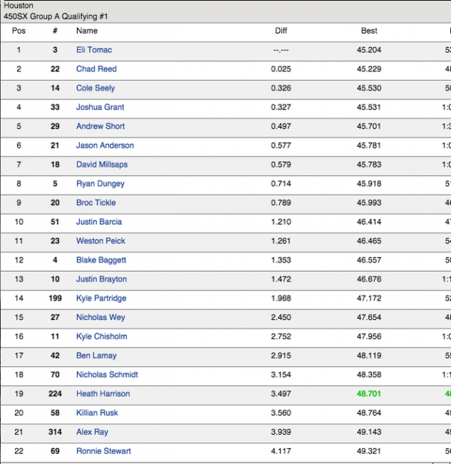 The first 450 session was a shootout. Josh Grant jumped to the top early, only to have Ryan Dungey take over with a 45.98. Then Cole Seely took the top spot. Then Davi Millsaps. Then Chad Reed. And finally Eli Tomac. The GEICO Honda rider set a 45.204 down late to take the pole in the first timed session. In all, the top nine were all under 46 seconds. This should be close for tonight.