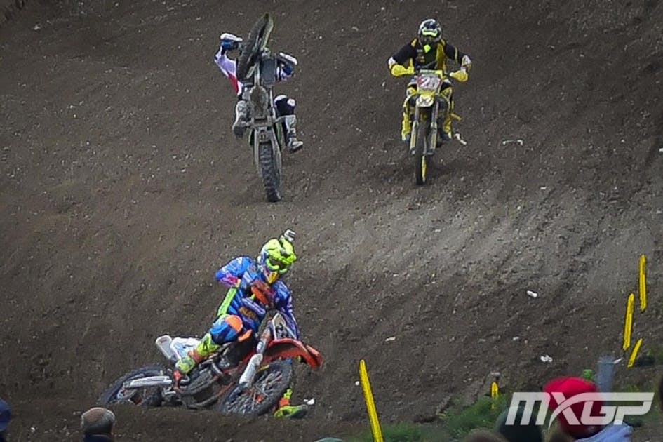 Yesterday at the MXGP of Trentino, Ryan Villopoto had a bizarre crash while being pressured from Clement Desalle for third, looping off the back of the bike entering the pit straight. Villopoto immediately left the track with an apparent back injury.